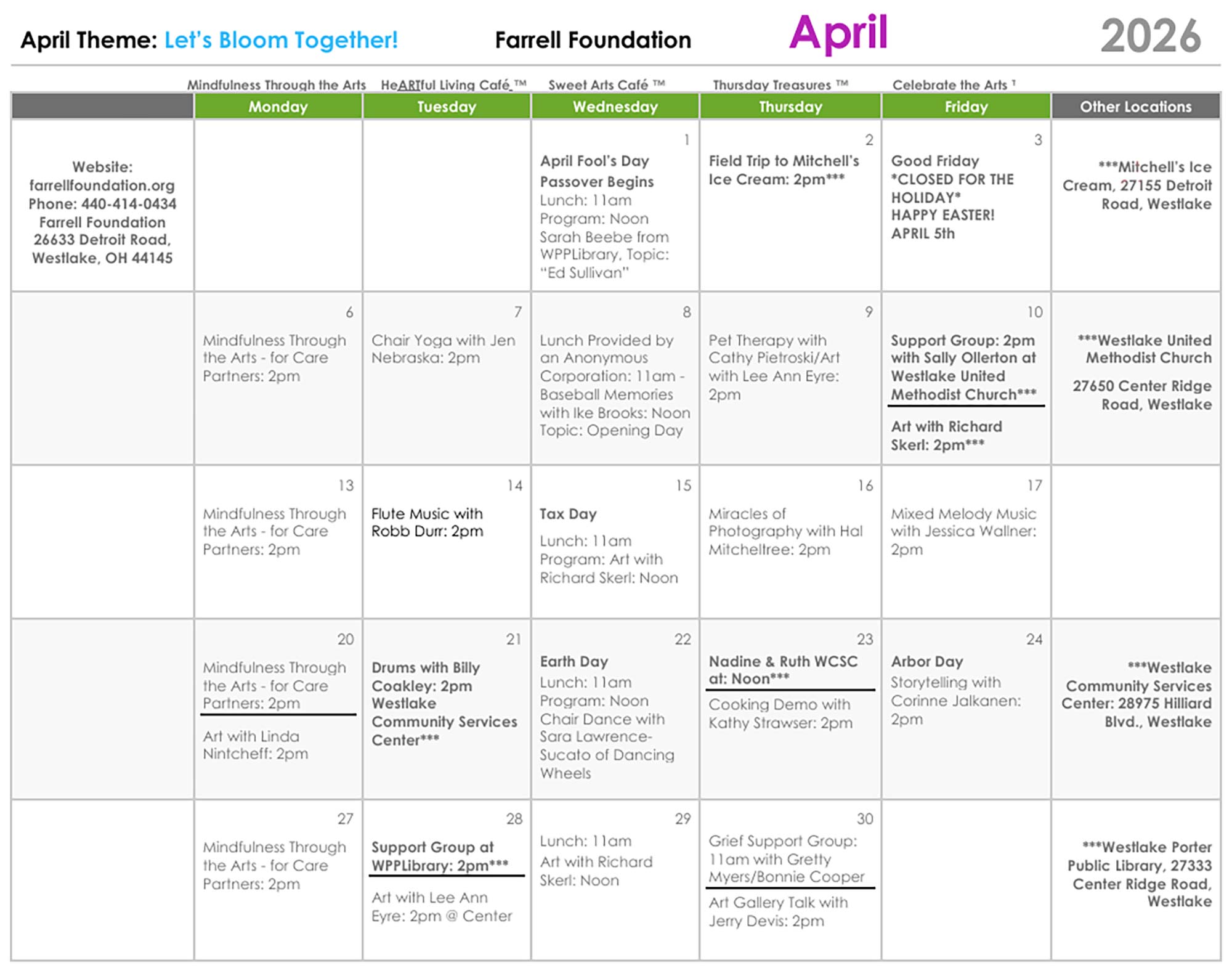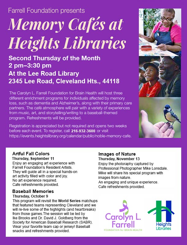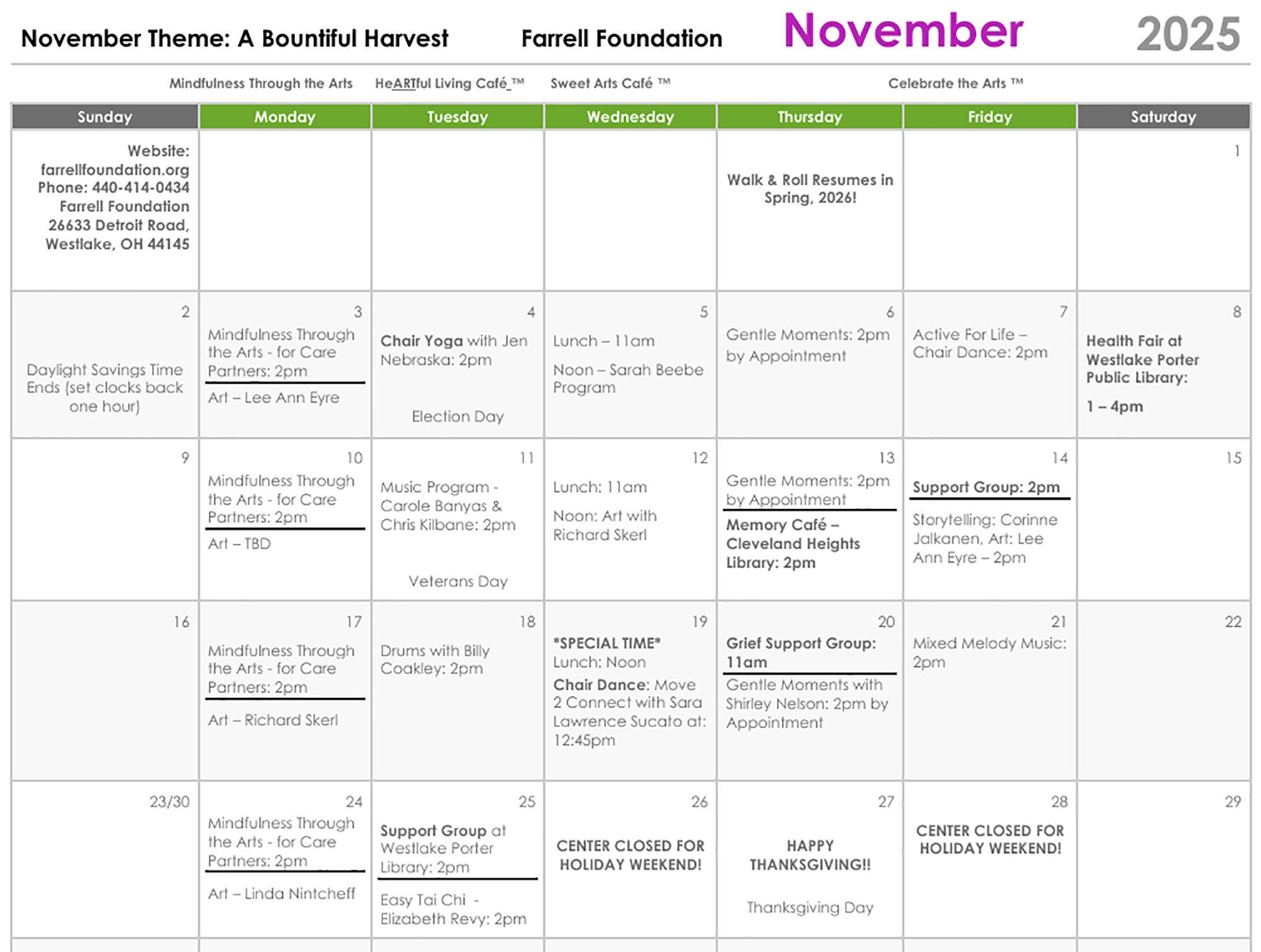 We welcome you to the Carolyn L. Farrell Foundation for Brain Health. Below is a video which will give you an overview of our Center for Artful Living and many of it’s enrichment and wellness programs for individuals impacted by dementia/Alzheimer’s and other cognitive health issues.