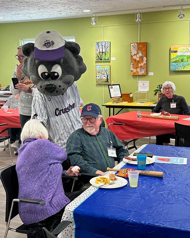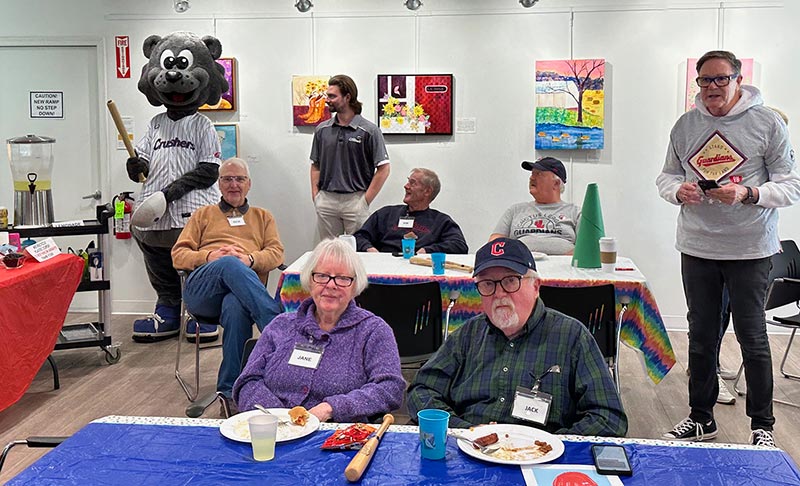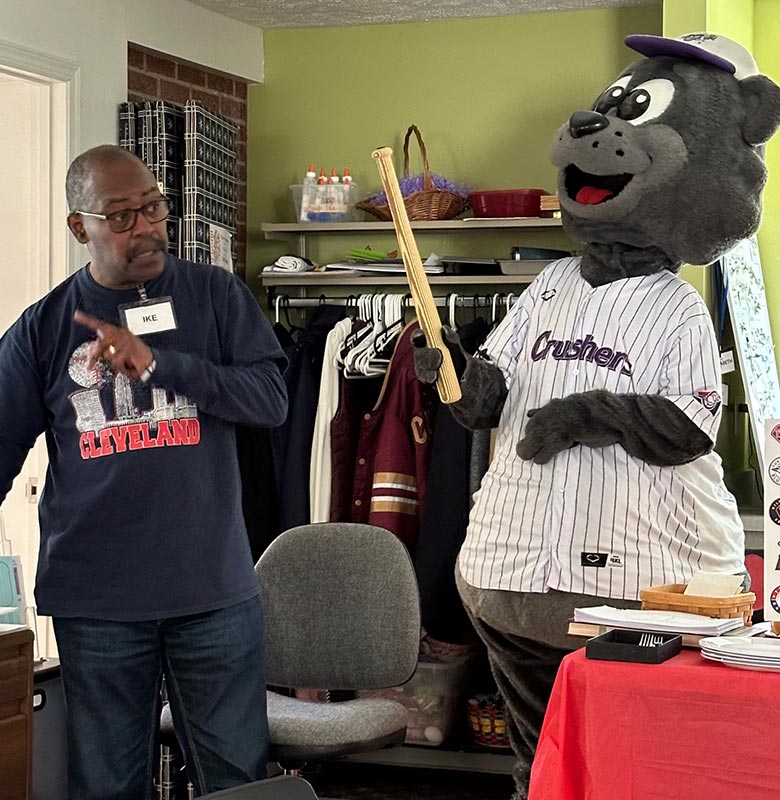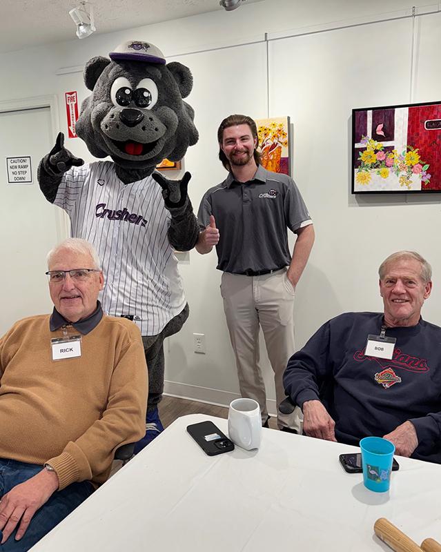 Stomper (L standing) and Zane from the Lake Erie Crushers join in the “Opening Day” Baseball program! In front is participants Rick (L) and Bob (R).