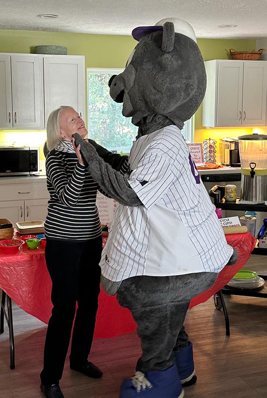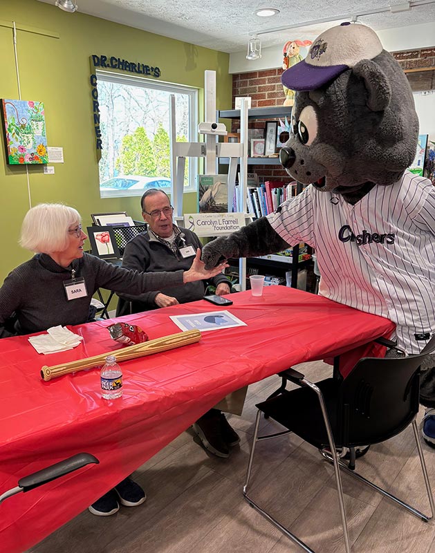 Ike Brooks from SABR, Society for American Baseball Research, presented the program on “Opening Day”! Here he is with his sidekick for the afternoon, Stomper!