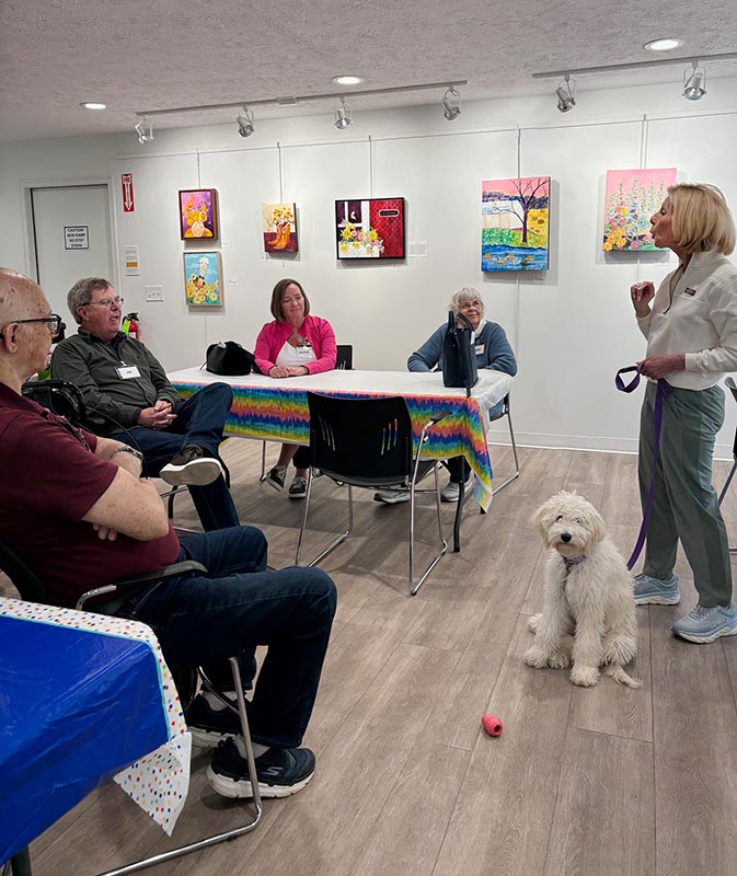 Cathy Pietroski (R) brought her Therapy Dog in Training, Gracie, to visit with folks in the Thursday’s Treasures program. Part of Gracie’s training is to be around people and to feel calm & comfortable with them! Volunteer Janis and participants Kathy & Jim plus Don enjoy Gracie’s program.
